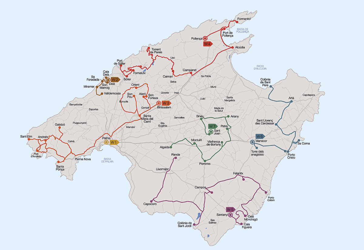 De mest omtyckta lederna brukar vara La Trapa ovanför Sankt Elm och Ärkehertigens stig ovanför Valdemossa, tack vare deras slående milsvida vyer. Största kontrasten från det hektiska badlivet är troligen den 25 minuter korta bilfärden som skiljer Magalufs skumparty från den ensliga vandringen mot det 1000 meter höga berget Galatzó. Många vandringar utgår från Sóller dit man enkelt tar bussen från Palma. Barnfamiljer brukar uppskatta den lite kortare vandringen till pittoreska Fornalutx eller den via fyren ovanför Port de Sóller då man kan avsluta med bad och lunch i hamnen.